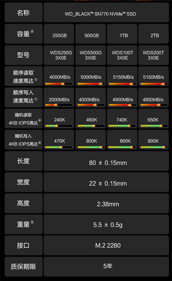 SN770系列为标准的M.2 2280形态,无缓存设计,支持HMB,顺序读写速度最高5.15GB/s、4.9GB/s,随机读写速度最高74万IOPS、80万IOPS,远超顶级的PCIe 3.0 SSD,是目前市面上性能最好的无缓存SSD之一。
